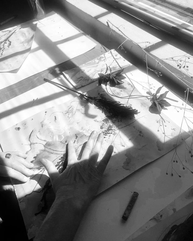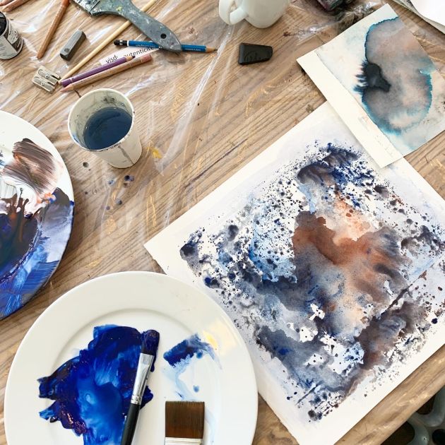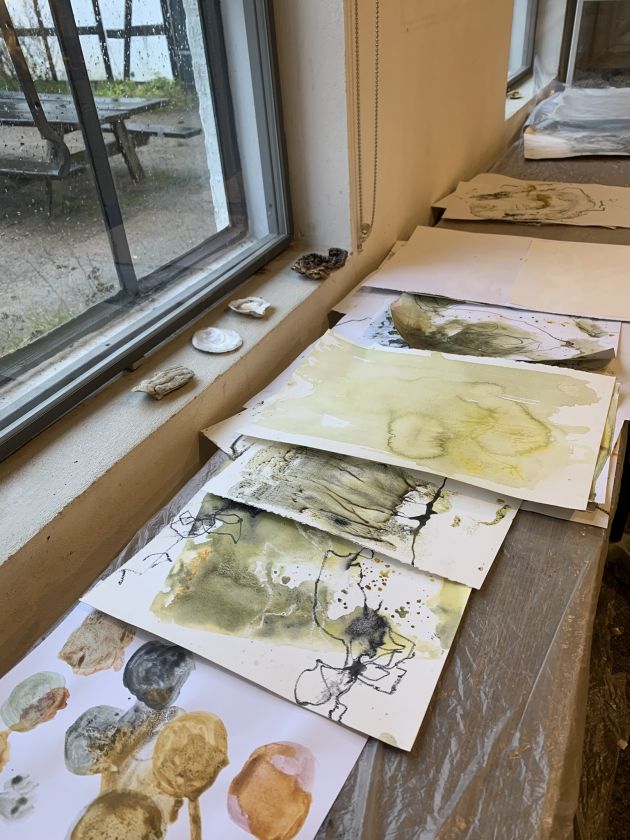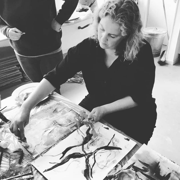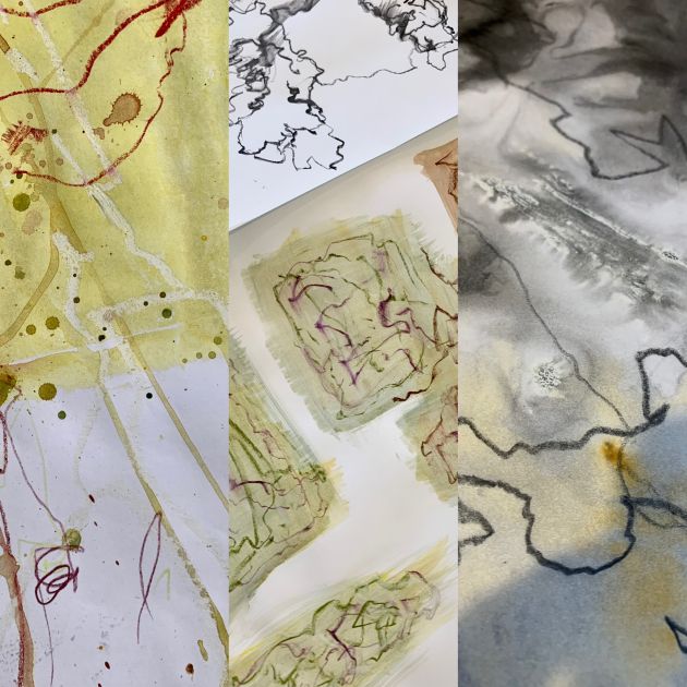 Vi har et særligt fokus på jorden, det der vokser af svampe, rødder, naturens skattekiste af forskellige strukturer. Særligt i denne workshop udvikler vi forskellige strukturer i materialerne inspireret fra naturens stoflige verden i de abstrakte eller mere figurative kompositioner. Vi bruger forskellige jordpigmenter, aske, kul i kombination med mere laserende flydende farver der skaber spændende overflader og sanselige materiale sammenstød.