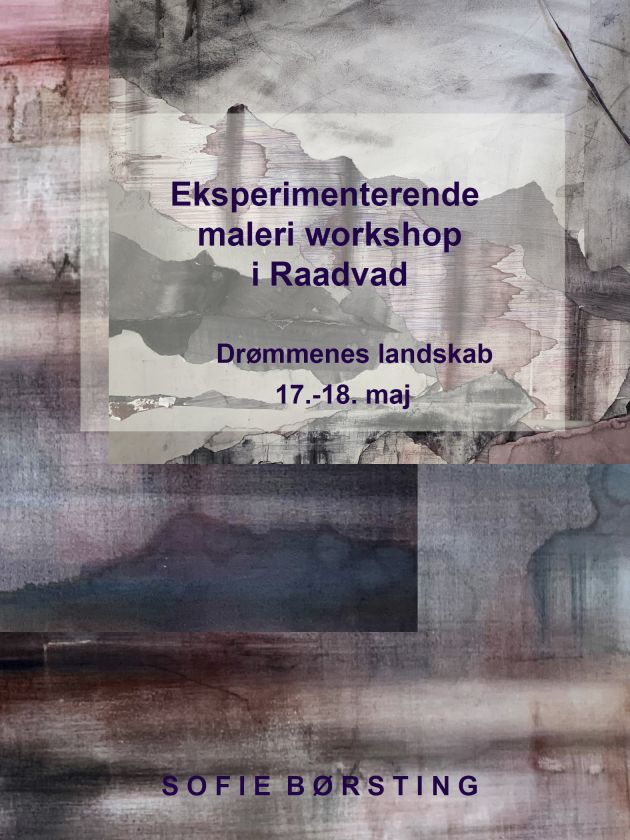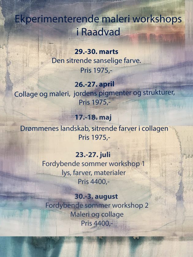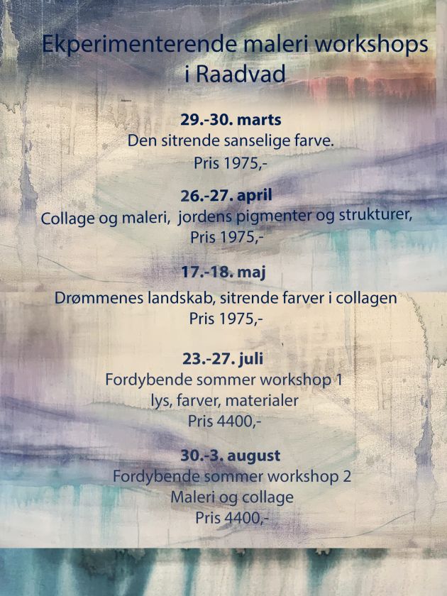 Workshops foregår i det naturskønne og historiske Raadvad i Naturskolens hyggelige lokaler tæt på mit eget værksted. På disse workshops arbejder vi med det abstrakte maleri med inspirations fra naturens mange strukturer, linjer og særlige lys. Man bliver guidet igennem en frigørende malerisk proces i de to dage workshoppen varer. Netop de mange forskellig maler processer og eksperimenter med professionelle materialer, er noget tidligere workshops deltagere har værdsat. Workshop kan tages enkeltvis eller det kan også anbefales at tage flere workshop forløb, hvis man ønsker at komme dybere ind i billedprocesserne og materiale teknikkerne. Som noget nyt er der også en broderi tekstil workshop.