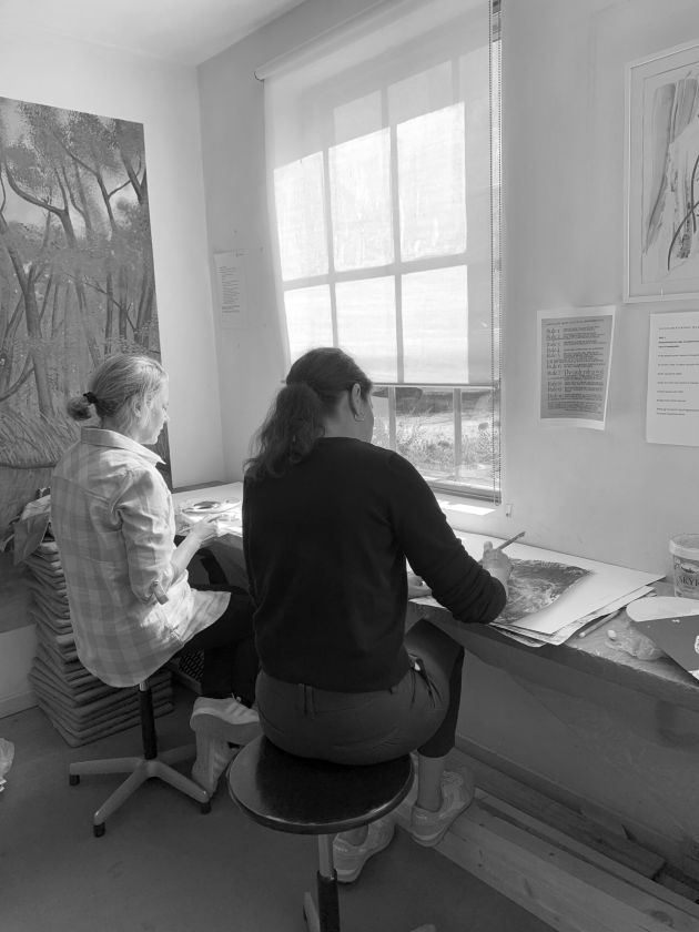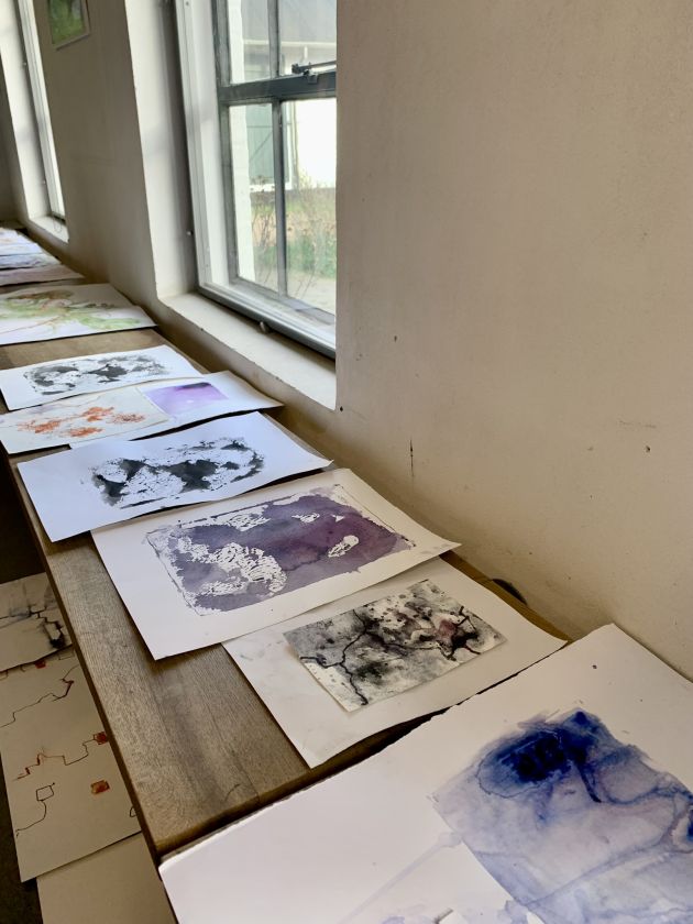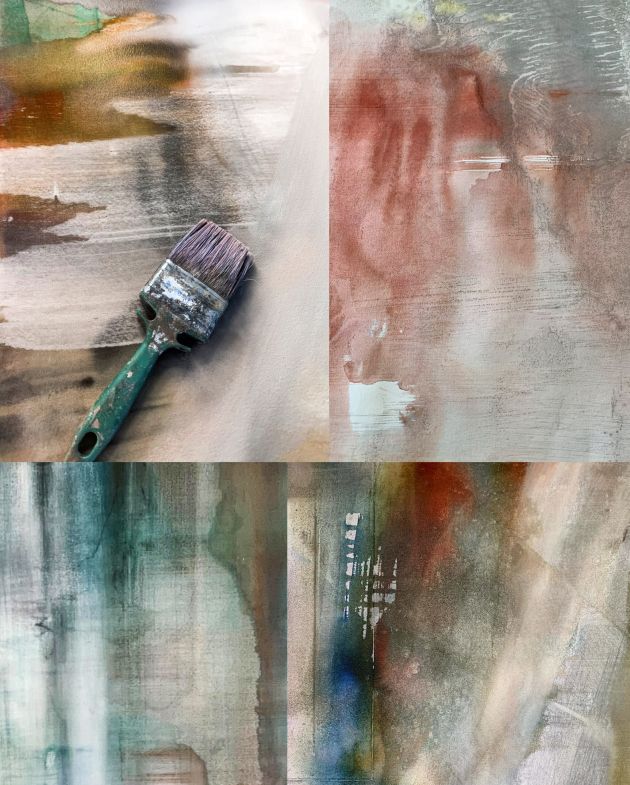 Vi arbejder med de blanke flader mod de matte, transparente lag og stofligheder, fra de helt lette lyse og æteriske til de mørkeste dybder. Vi blander gouacher fra det ypperligst mærke Turner der er blevet mine nye yndlingsfarver og de ypperlige Golden akryl farver i kombination med aske, tørpastel, oliekridt etc.