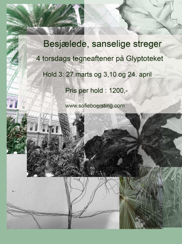 Det handler og at give sig tid og se og opleve malerierne, skulpturer, planterne og rummene gennem tegningen og at nyde processen og stemningen i Glyptoteket. Via nærværet og oplevelserne med kunsten kommer vi tættere på vores egne unikke og besjælede streger. Den stille streg og tegningen er noget af det mest meditative jeg kender. Langsomt bygges der op og gives plads til det enkle, lys, skygge og nye ideer….